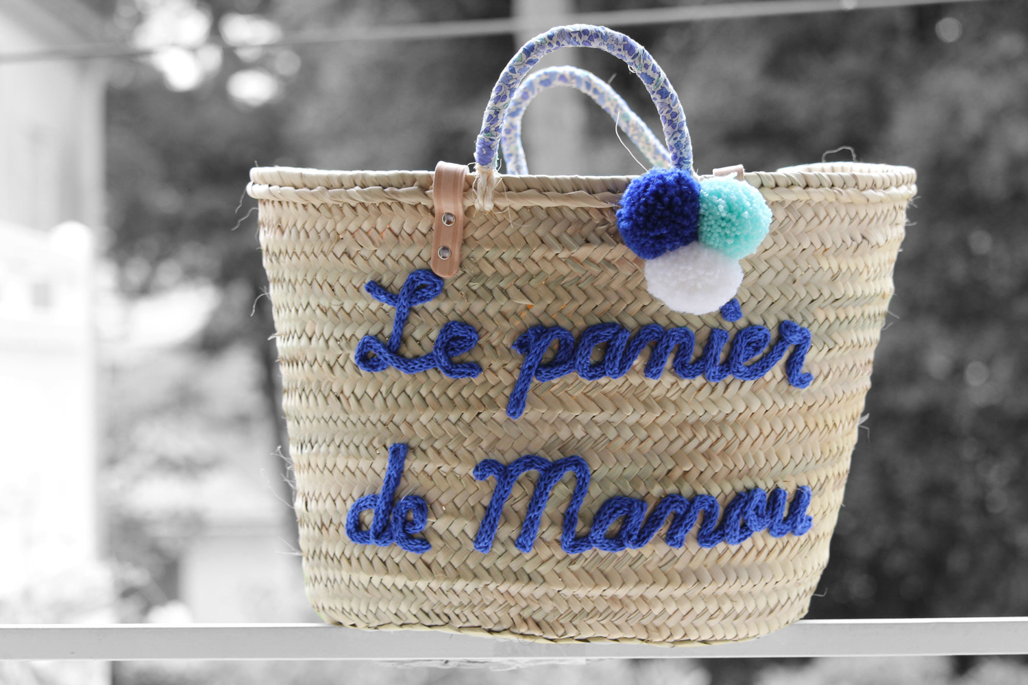 Liberty sur les anses coordonné à l'inscription et 3 jolis pompons.